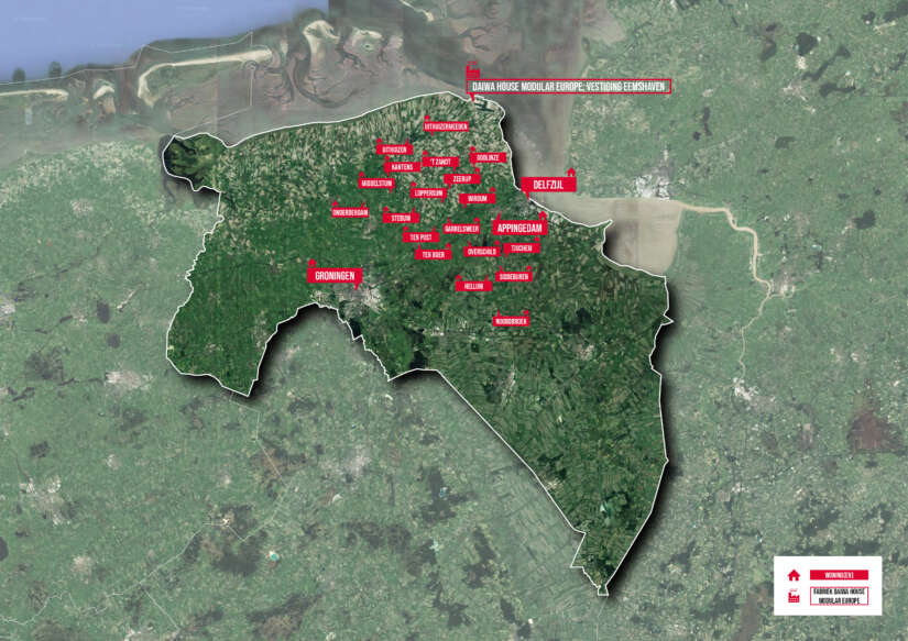 Afgelopen vrijdag leverden we 31 woningen op aan de Hilmaarweg in Stedum. Met deze oplevering hebben we de grens van 500 opgeleverde woningen in Noordoost Groningen gepasseerd en daar zijn we trots op! Daiwa House Modular Europe blijft doorbouwen aan een veilig thuis voor de bewoners van het Groningse aardbevingsgebied. Benieuwd waar onze aardbevingsbestendige woningen te vinden zijn? Je ziet het op onderstaande afbeelding.